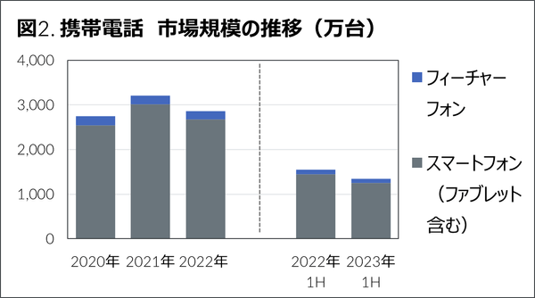 携帯電話の販売数量は、前年比13%減の1,340万台となった(図2)。そのうち9割強を占めるスマートフォン(ファブレット含む)は同13%減の1,250万台、フィーチャーフォンは同14%減の90万台となった。3年前のコロナ初年度での販売急減、21年の反動での伸長を経て、22年以降買い替え需要の減少が続いている。