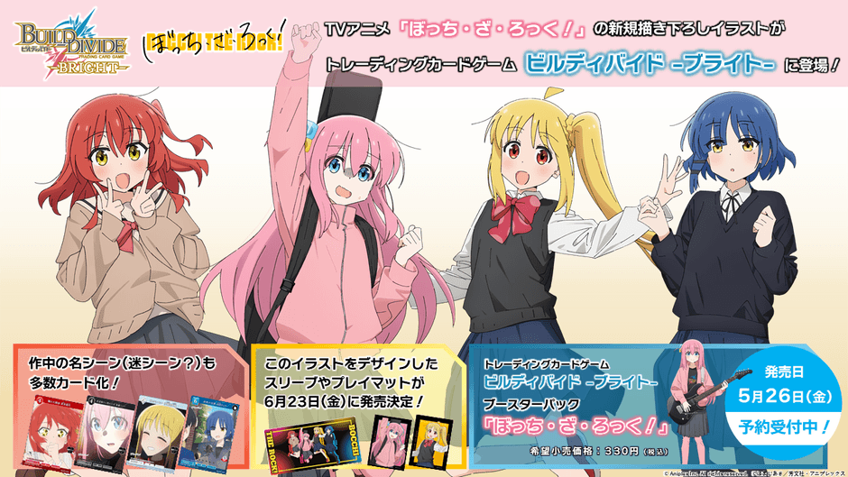 「ビルディバイド ‐ブライト‐」はこれまで、ブースターパック「リコリス・リコイル」やブースターパック「天元突破グレンラガン」を発売し、5月26日(金)にはブースターパック「ぼっち・ざ・ろっく!」の発売を予定しております。
