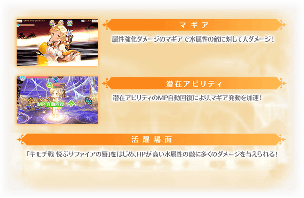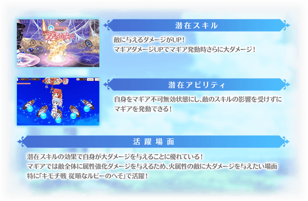 『期間限定 水着魔法少女2020-2021 ピックアップガチャ』では、下記ピックアップ対象の魔法少女およびメモリアの提供割合がアップしております。