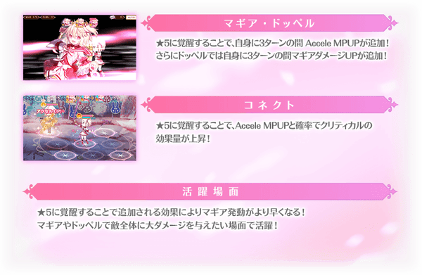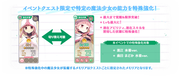 対象の魔法少女を編成して本イベントクエストをプレイする際にステータスを特殊な状態に強化することができます。