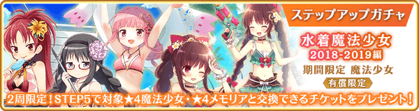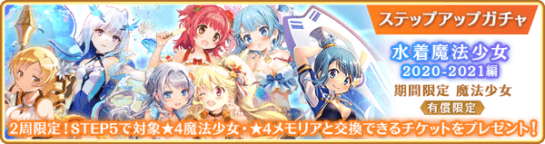 また、本ガチャの開催と合わせて『期間限定 水着魔法少女2020-2021 ピックアップガチャ』をお得に引ける『有償限定 ステップアップガチャ 水着魔法少女2020-2021編』を開催いたします。