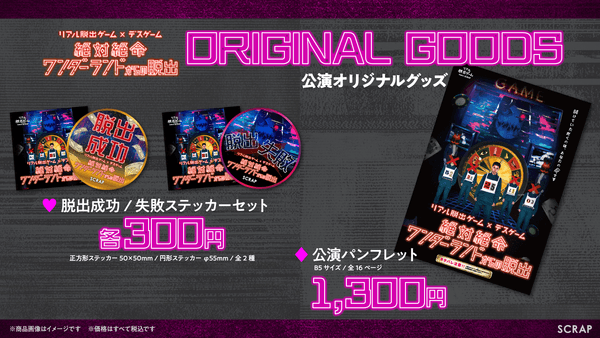 リアル脱出ゲームを企画運営する株式会社SCRAP(所在地:東京都渋谷区、代表者:加藤隆生)は、2022年9月1日(木)より開催する新作リアル脱出ゲーム『絶対絶命ワンダーランドからの脱出』の公演オリジナルグッズを販売することを発表いたします。