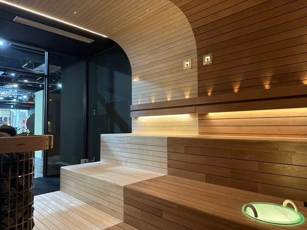 2025年4月にオープンした、北海道札幌市定山渓の休日湯サウナ室には、サーモリーのサーモアスペン材が使われています。節のない美しい外観はサウナ室の世界観を引き立て、滑らかな肌触りがサウナ体験を心地よく彩ります。さらに、サーモリーのサーモウッドは含水率が2~3%と非常に低いため熱伝導率も低く、高温のサウナ室内でも床面の温度も熱くなりすぎません。