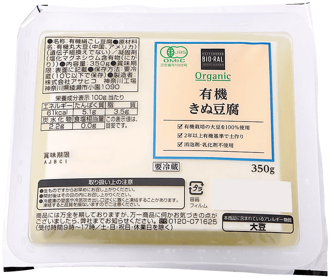 からだに優しい豆腐をご提供するため、有機JAS認定を受けた大豆を100%使用し、有機JAS認定を受けた神奈川県の工場で生産。消泡剤・乳化剤は使用せず有機大豆と海水にがりのみで製造し、大豆の甘みや風味を引き立てました。