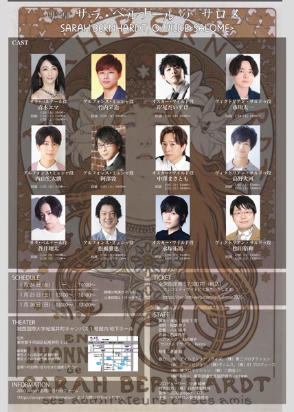 サラサロメ製作委員会主催、朗読劇 サラ・ベルナールの『サロメ』が2025年1月24日 (金) 〜 2025年1月26日 (日)に城西国際大学 紀尾井町キャンパス(東京都 千代田区 紀尾井町3−26 学校法人 城西大学 東京紀尾井町キャンパス)にて開催されます。