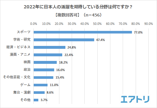 2022 年は直近で”北京2022 冬季オリンピック”が予定されているためか「スポーツ(77.0%)」の期待値が高いことがわかりました。2 位は「学術・研究(47.4%)」、3 位は「経済・ビジネス(24.8%)」でした。