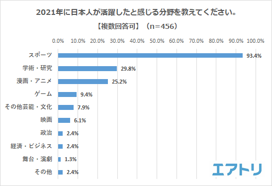 ”オリンピックイヤー”となったということもあり今年は「スポーツ(93.4%)」の分野で日本人が活躍したと感じる人が多かったことがわかりました。続いて「学術・研究(29.8%)」、「漫画・アニメ(25.2%)」となりました。