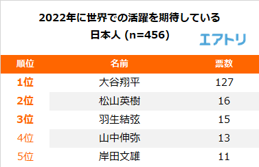 2022 年に世界での活躍を期待している日本人を聞いたところ、「大谷翔平(127 票)」が1 位となり、2 位は「松山英樹(16 票)」が選ばれ、2021 年に活躍した人の更なる飛躍に期待する人が多い事がわかりました。3 位には「羽生結弦(15 票)」がランクインし、北京2022 冬季オリンピックへの期待が伺えました。