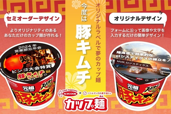 大人気シリーズの新作!オリジナルラベルで作れるカップ麺に、ピリッとした旨味がたまらない「豚キムチ」が加わりました。