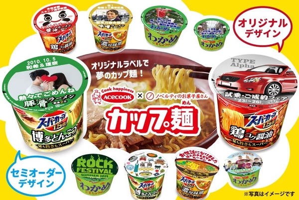 スーパーカップやわかめラーメンを、オリジナルデザインで制作可能。ミニサイズも選べるので、軽いノベルティにも最適です。