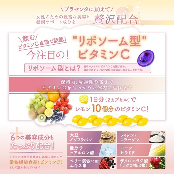 (※4)極小カプセルにビタミンCを閉じ込めることで「通常のビタミンCの2倍の吸収力」に高めることを実現したもの (※5) )臨床試験による結果 (※6) プラセンタサプリメントジャンルにおいて(Amazon調べ)