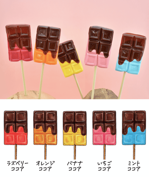 キュートな見た目で昨年大人気だった板チョコロリポップが今年も期間限定発売。ココアキャンディとラズベリー、オレンジ、バナナ、いちご、ミントそれぞれのフレーバーの掛け合わせをお楽しみください。