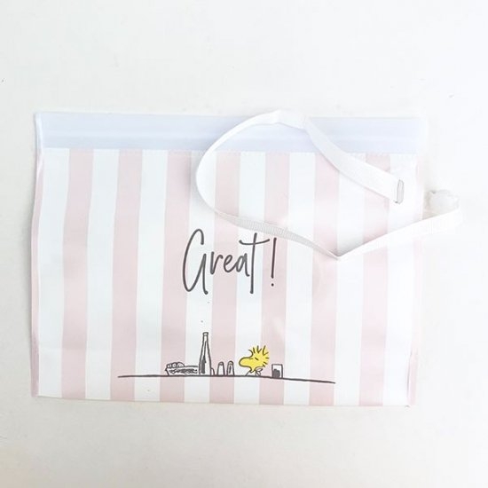 ピンクのストライプもかわいい、デザイン違いもご用意していますよ♪裏面にもウッドストックのワンポイントが入っています。