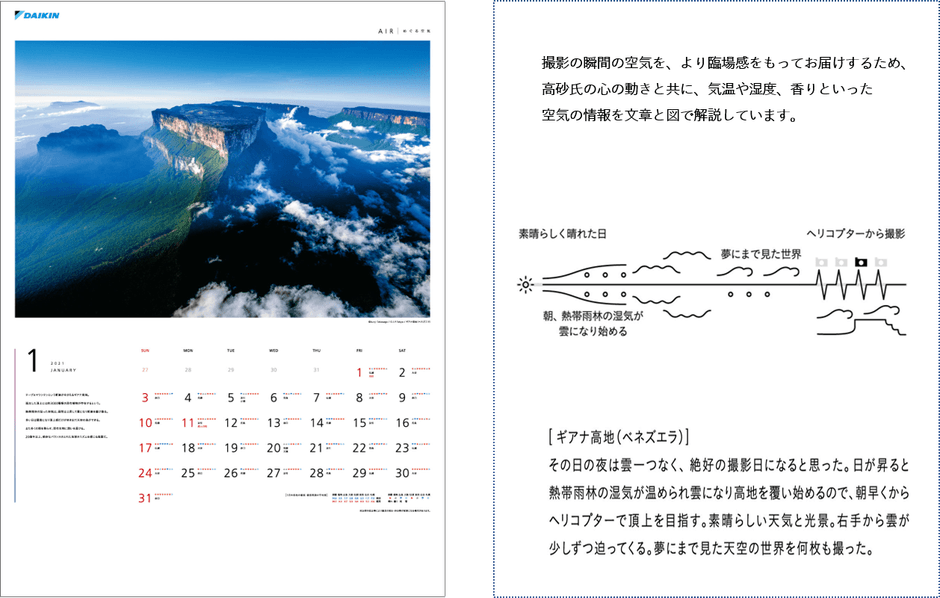 空調業界のグローバルリーディングカンパニーをめざす当社は、「空気には無限の可能性がある」と信じ、あらゆる場面にふさわしい“高品質な空気”を提供したいと考えています。本カレンダーは、当社が理想とする空気の一端に触れていただき、身近な空気にもっと関心を持ってもらいたいというコンセプトで制作しています。
