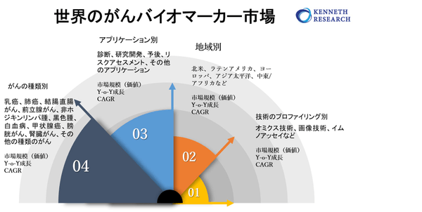 世界の癌バイオマーカー市場は、アプリケーション別(診断、研究開発、予後、リスクアセスメント、その他のアプリケーション)、癌の種類別(乳癌、肺癌、結腸直腸癌、前立腺癌、非ホジキンリンパ腫、黒色腫、白血病、甲状腺癌、膀胱癌、腎臓癌、その他の種類の癌)、技術のプロファイリング別(オミクス技術、画像技術、イムノアッセイ)などによって分割されています。レポートは、各セグメントの成長機会とともに、成長を促進する要因について説明しています。さらに、Y-o-Y成長(%)収益(USD百万単位)は、各セグメントの市場成長を牽引する要因と共にレポートに記載されています。