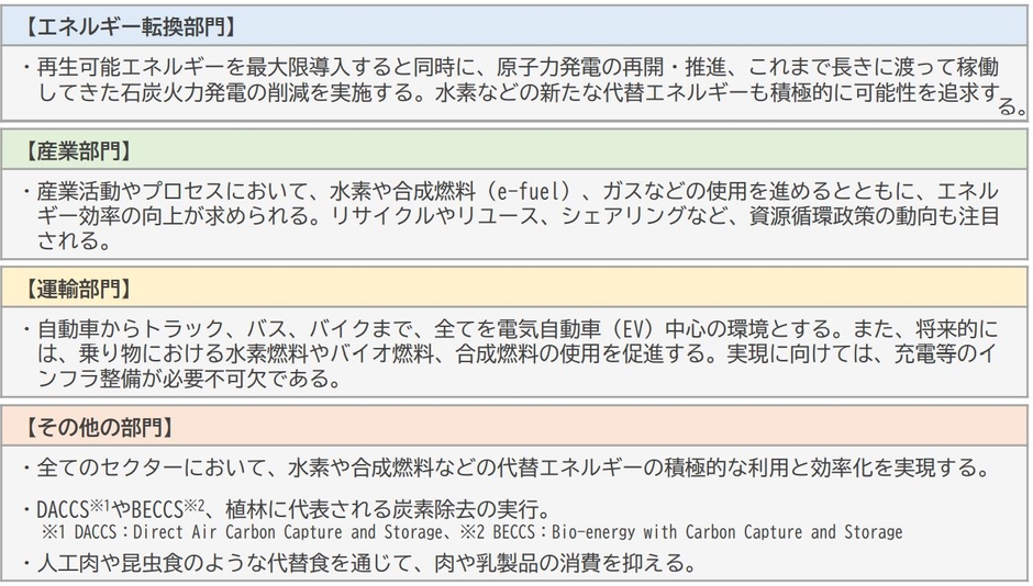 日本におけるCO2の排出量を部門別で見た場合、エネルギー転換部門と産業部門、運輸部門の順で大きくなっており、カーボンニュートラルに向けては、排出量の大半を占めているエネルギー転換部門における取り組みが最も重要であり、政府や内閣もそれについて方針を示している。日本が掲げる目標を達成するため、以下のような取り組みが推進されることになる。