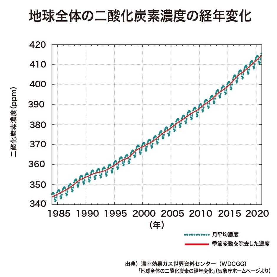 参照:地球全体のCO₂の経年変化/気象庁 (2022年10月27日)https://www.data.jma.go.jp/ghg/kanshi/ghgp/co2_trend.html