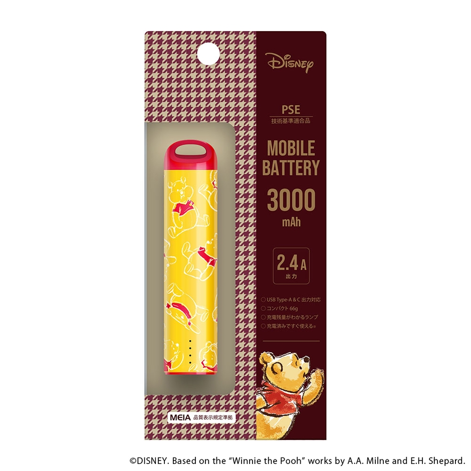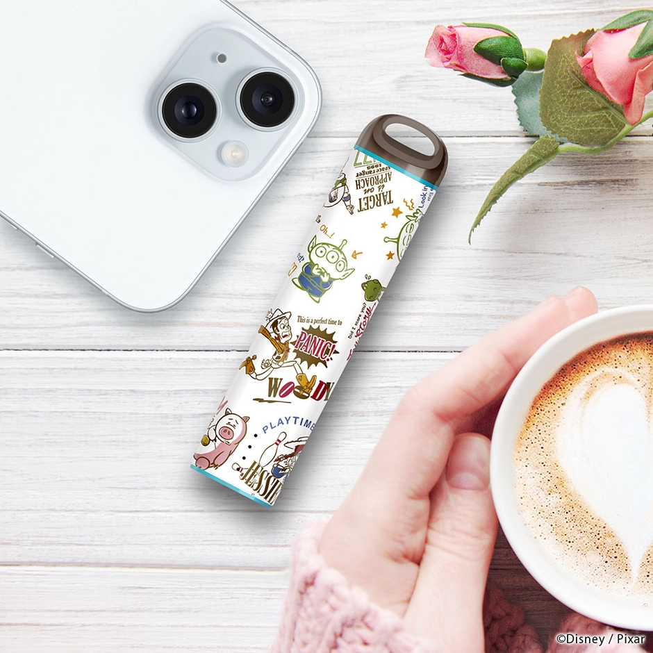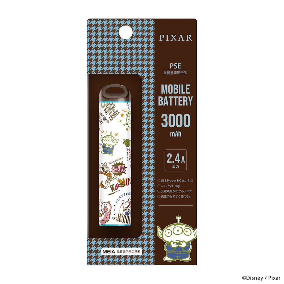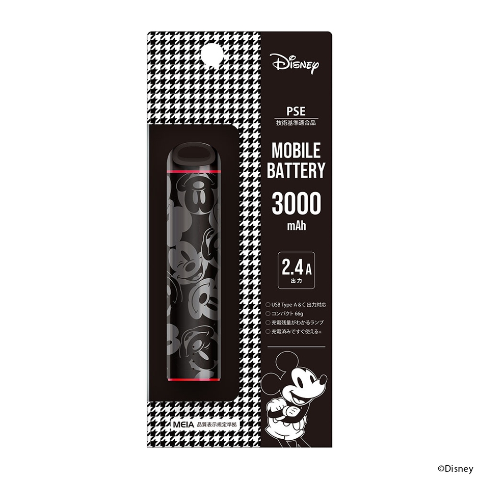 ディズニーキャラクターデザインの軽量コンパクトでポーチにも収まるスティック型モバイルバッテリー 3,000mAhです。USB type-A/Type-Cポートでの出力対応・2台同時充電も可能です。また、スマートフォン本体を充電しながらモバイルバッテリーも充電できるパススルー充電に対応しています。お手持ちのストラップを付けて落下を防止できる便利なストラップホール付き。充電済みですぐ使える(※満充電ではありません。)。PSE適合商品。