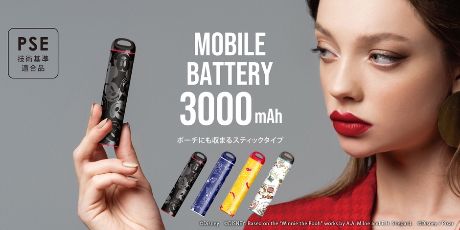 ディズニーキャラクターデザインのポーチにも収まる軽量コンパクトなスティックタイプのモバイルバッテリーを4色展開で株式会社PGAが3月13日から新発売
