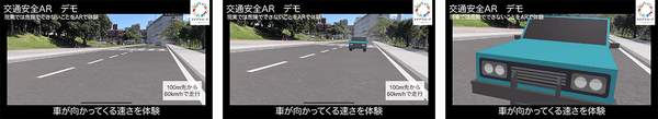 横断歩道が無い場所で道路を渡ろうとする際に、遠くに見える車が向かってくる速さを体験できます。