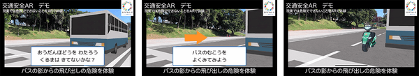 横断歩道を渡る際バスやトラックなど大きな車の影からバイクや自転車が飛び出してくる体験ができます。