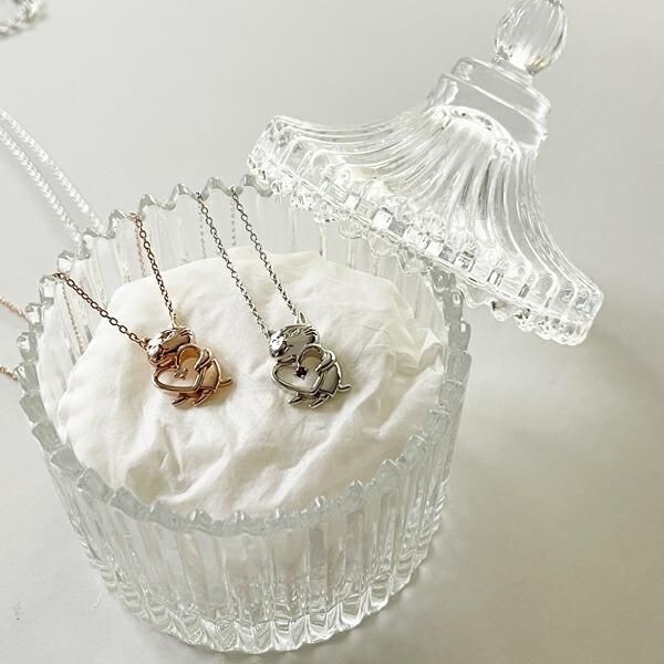 モチーフとなるアンジーのデザインは、このジュエリーのために描きおこされた特別なもの!大きなハートをギュッと抱きしめたような姿、ぷっくりつるりとしたキュートなお顔、優しくカーブを描くボディラインがとっても素敵です。キャラクターの、アニマルモチーフですが大人がさりげなく身につけることができる上品さが魅力ですね。