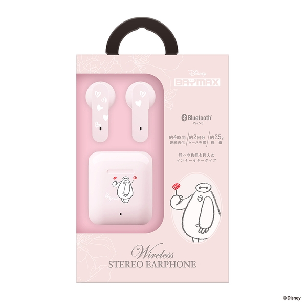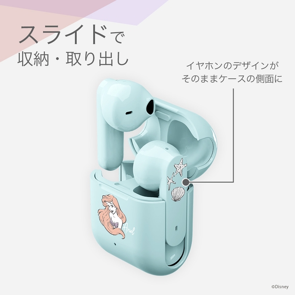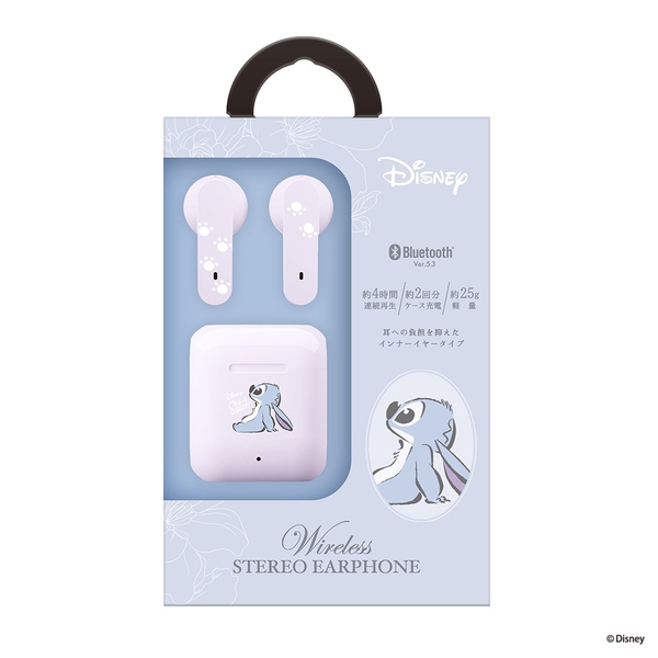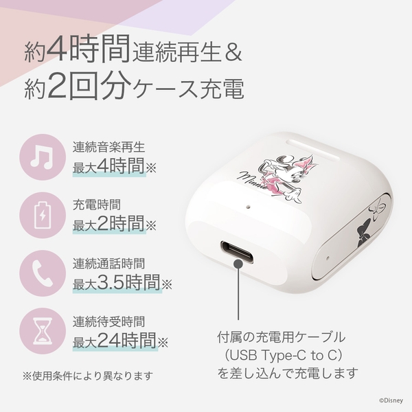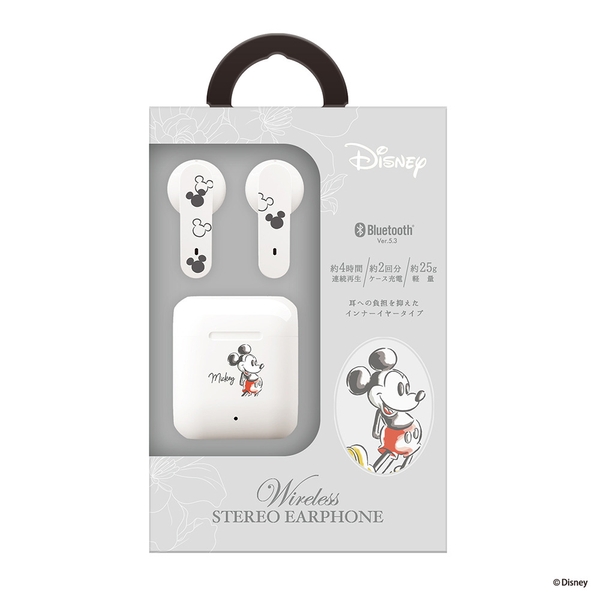 かわいいディズニーキャラクターデザインの完全ワイヤレス ステレオイヤホン インナーイヤータイプです。省電力、高速通信のBluetooth® 5.3を搭載しています。イヤホン本体は簡単に着脱でき、密着する違和感や長時間での疲労感を感じにくいインナーイヤータイプです。充電ケースは高さ39mmのコンパクトサイズで、イヤホン本体を収納しても約25gと軽く、持ち運びにも邪魔になりません。充電ケースはイヤホン本体を約2回フル充電できます。
