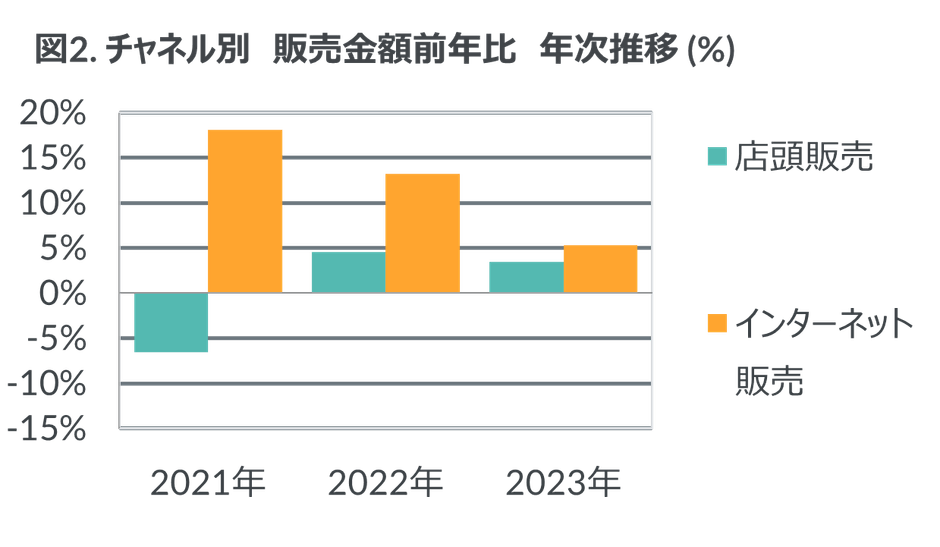 販売チャネル別で見ると、インターネットは金額前年比5%増となった(図2)。インターネットの成長率は店頭を上回ったものの、2022年までの2年連続二桁成長がストップし、2023年第二四半期以降、成長率が鈍化する動きとなった。また、店頭販売は金額前年比4%増と2022年に続き堅調に推移した。