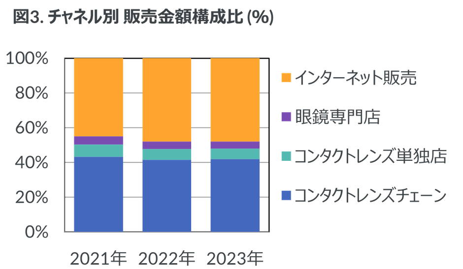 2023年におけるチャネル別販売金額構成比は2022年とほぼ同じ結果となった。近年拡大を続けていたインターネットが金額前年比でマイナスに転じ、9%減となったことが市場全体にも大きく影響した。一方、店頭販売全体でも9%減となり、特にコンタクトレンズチェーンの減少幅が前年よりも大きくなった。1日使い捨てレンズ市場がさらに拡大している中で、ケア用品に対する消費者の需要減や販売店側の意向などケア用品市場の回復につながりにくい状況があると思われる。一方で2週間使い捨てレンズでの新商品発売の動きが見られ、今後の追い風となるか注視したい。