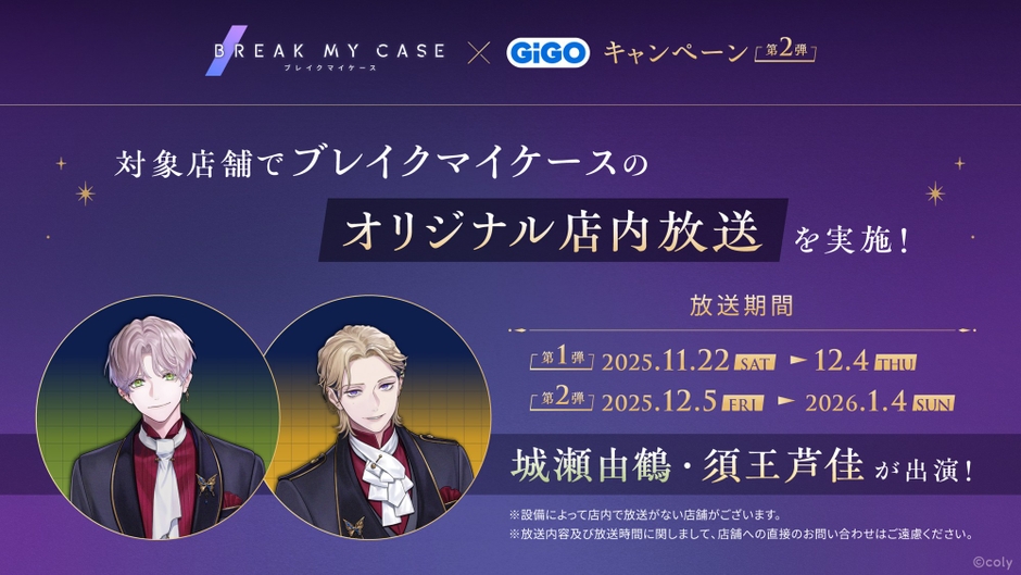 株式会社GENDA GiGO Entertainment(本社:東京都港区 代表取締役社長:二宮 一浩、以下「当社」)は、当社の対象店舗において、2025年12月5日(金)より、株式会社coly(本社:東京都港区 代表取締役社長:中島 杏奈)が手掛けるアプリゲーム「ブレイクマイケース」とのコラボレーションしたキャンペーン第2弾を開催いたします。