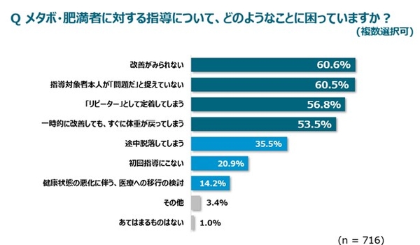保健指導に従事している方に「メタボ・肥満者に対する指導について、どのようなことに困っていますか?」と質問をしたところ、「改善がみられない」の60.6%に次いで、「指導対象者本人が「問題だ」と捉えていない」が60.5%、「「リピーター」として定着してしまう」が56.8%、「一時的に改善しても、すぐに体重が戻ってしまう」が53.5%という結果になりました。指導対象者本人に課題意識を持ってもらうことや継続的に生活習慣を改善することの難しさが浮き彫りになりました。
