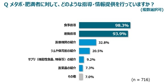 保健指導に従事している方に「メタボ・肥満者に対して、どのような指導・情報提供を行っていますか?」と質問をしたところ、「食事指導」が98.3%、「運動指導」が93.9%となり、いずれも9割以上の方が実施していることが分かりました。