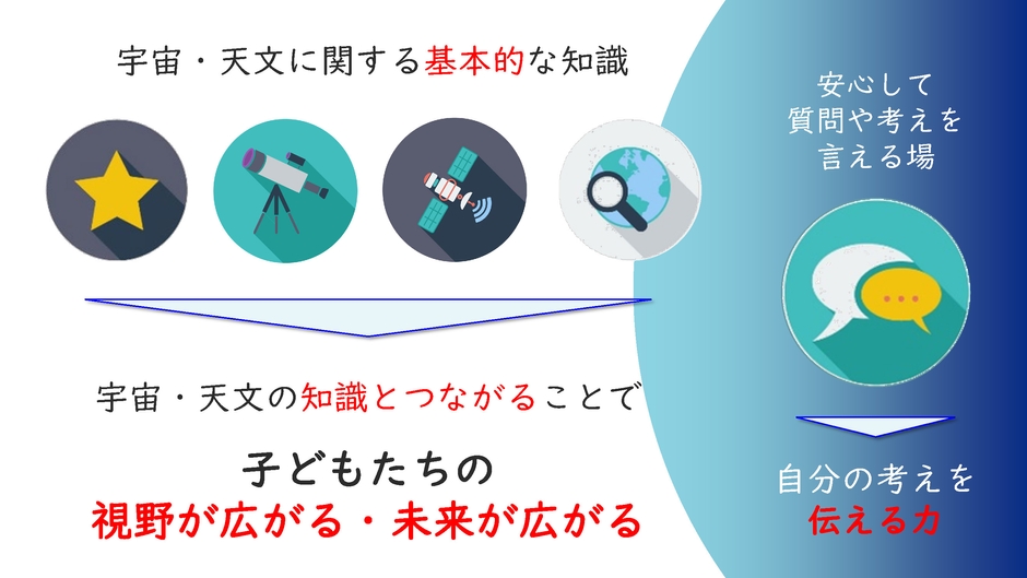 大人はもちろん、夢や希望にあふれた子どもたちのために、小さなことから一歩ずつ、「宇宙・天文」に関する事業を進めてまいります。