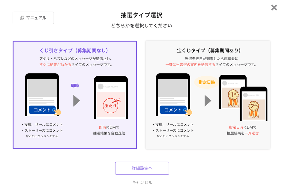 アップデートに伴い、募集期間の有無が異なる2つの抽選タイプから選べるようになり、抽選企画をより簡単に行えるようになりました。
