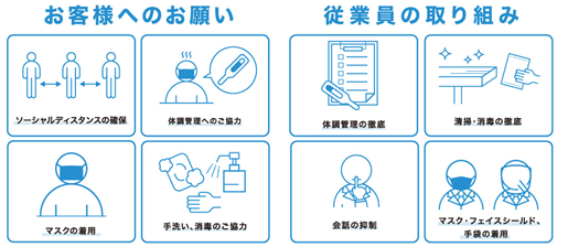 政府及び関係各所からの発表や指導に基づき、ご利用いただく皆様に安心して快適にお過ごしいただけますよう、衛生管理の強化や感染防止対策に取り組んでおります。従業員の対策はもちろん、ご来場のお客様にも感染防止対策のご協力をお願いいたします。