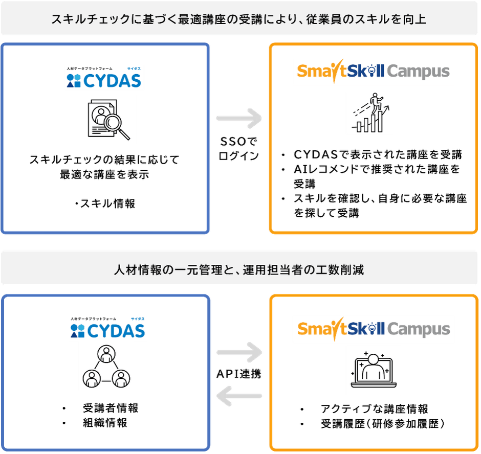 【リスキリング加速へ】スキルチェック結果に基づいた最適講座をレコメンド!タレントマネジメントシステム「CYDAS」と学習管理システム「SmartSkill Campus」が連携