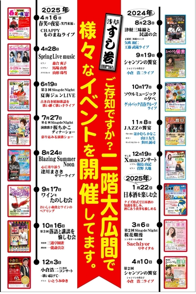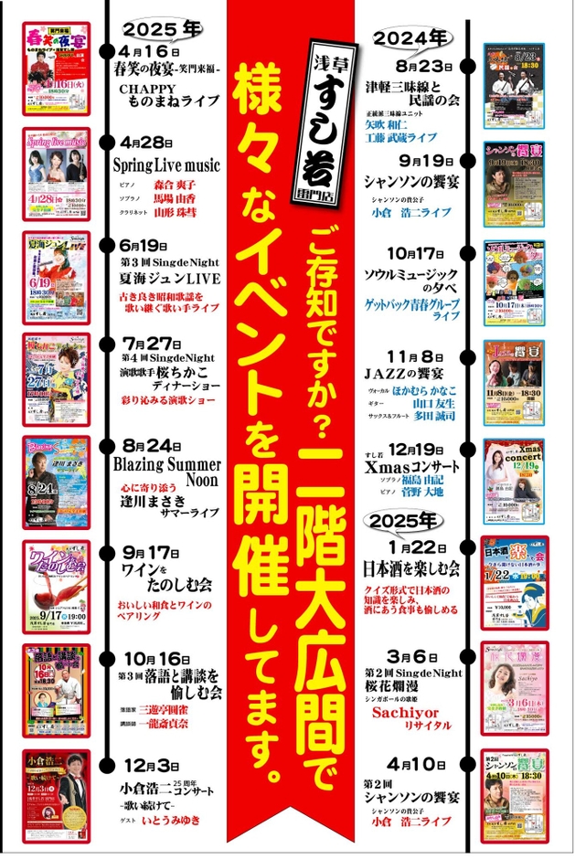 「浅草すし若 雷門店」は、通常の宴席利用にとどまりません。各種イベントに対応できる広々とした空間を活かし、月に一度のペースで特別な企画を開催しています。リサイタル、ライブ、ショーなどを楽しみながら食事ができるユニークな体験は、浅草の夜をさらに特別なものにしてくれるでしょう。