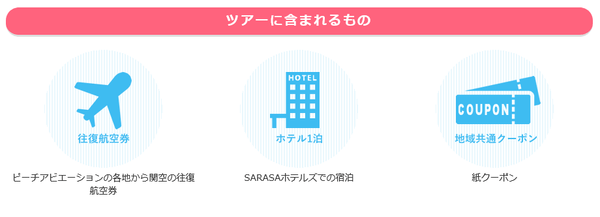 Peach Aviation(ピーチアビエーション)での各地から関西国際空港までの往復航空券とホテル宿泊がセットになったGo Toトラベルキャンペーンのツアーです。