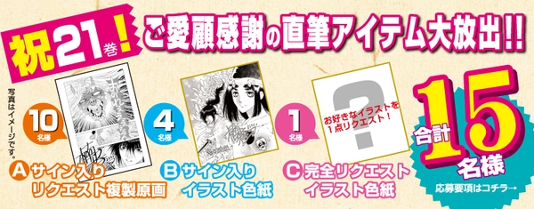 コミックスお買い上げの方の中から合計15名様に、直筆リクエストイラスト色紙を含めた豪華景品をプレゼント! リクエストは桂作品ならば内容は何でもOK!!