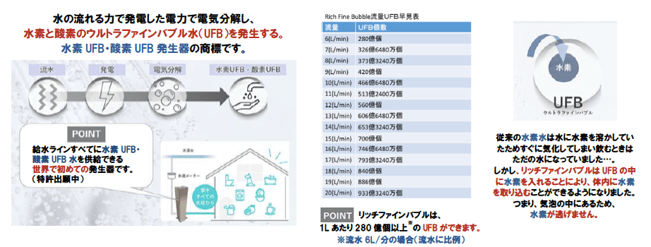 同製品は、水道水の流れを利用して発電し、その電力で水を電気分解することにより水素UFBと酸素UFBを発生させるシステムで、給水ラインにあるすべての水栓からは常に水素と酸素のUFB水が供給され、しかも電気代が掛からない画期的な製品です。