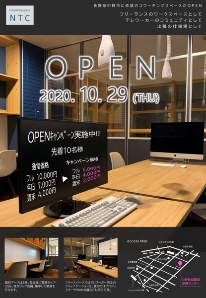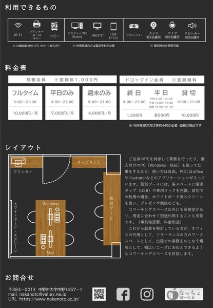 長野県中野市の中野地域職業訓練センターに、待望のコワーキングスペースがオープン。 フリーランスの方が気軽に使えるスペース、出張の際の仕事場、テレワーカーがコミュニティを作る場所など、多様にご利用できます。