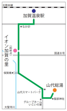 山代温泉総湯(降車のみ)とイオンを往復、イオンと加賀市医療センターを通過して加賀温泉駅ロータリー(降車のみ)を往復するルート