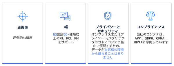 独自の機械学習アルゴリズムを用いてテキスト、PDF、文書、トランスクリプト、大規模言語モデル(LLM)などへ52以上の言語で、50種類以上の個人を特定できる情報(PII)を検出、再編集、置換します。近年企業が取り扱うデータ流通は日々増えていますが、Private AIによりAIの運用やデータ分析の際に個人情報保護法やGDPRなどの法における個人情報を、個人識別符号を含めて網羅的にリアルタイムで必要な処理をすることができます。日本へは2023年9月に進出し、ガートナー社のプライバシー分野におけるCool Vendors 2023に5社中の1社として選出されています。