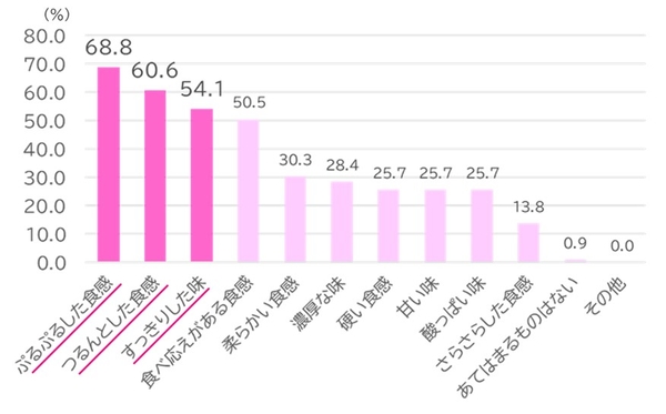 さらに、女性にゼリー飲料の食感や風味の好みを聞いてみました。その結果、「ぷるぷるした食感」が68.8%、「つるんとした食感」が60.6%、「すっきりした味」が54.1%でした。