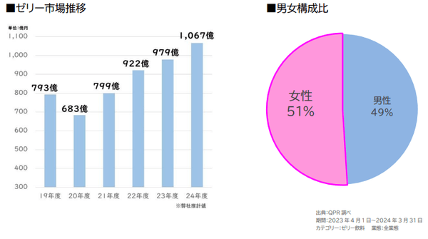 近年のゼリー市場は大きく成長しており、約1,000億円規模の市場となっております。その理由として、コロナ禍による飲用体験者の増加やニーズが拡張した事、おにぎりやパンの価格高騰による影響などが考えられます。