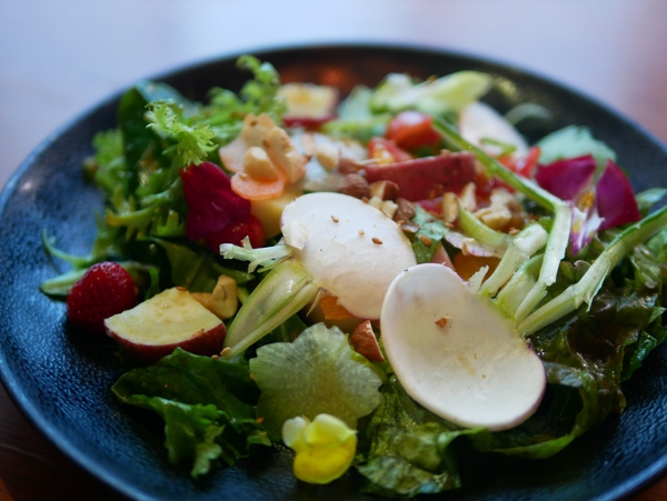 サラダだけでもハーブやタンポポ、柑橘のフルーツやさつま芋など多種多様な食材を約20種類ほど使用しており、見た目も華やかに、味覚でも季節を感じられます。