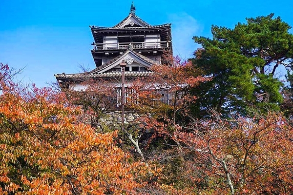 宿から車で約40分、福井県坂井市に北陸唯一の現存天守である丸岡城(霞ヶ城公園)があります。別名「霞ヶ城」としても知られ、町のシンボルとして親しまれています。周囲には日本庭園式の霞ヶ城公園があり、例年11月中旬頃には園内から紅葉に囲まれた天守閣を拝むことができます。