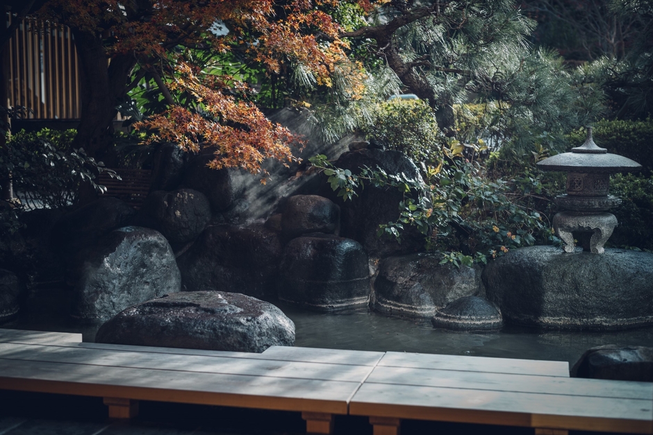 界 伊東には、広々とした日本庭園があり、秋になると木々は色鮮やかに紅葉し、ツワブキ、イソギクといった草花も顔をみせます。日本庭園に面した「湯上がり処」で、趣のある石灯篭を眺めつつ、心落ち着くひとときを過ごせます。