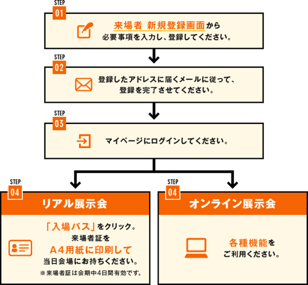 来場者証の印刷が必須ですので、必ず登録の上会場までお越しください。