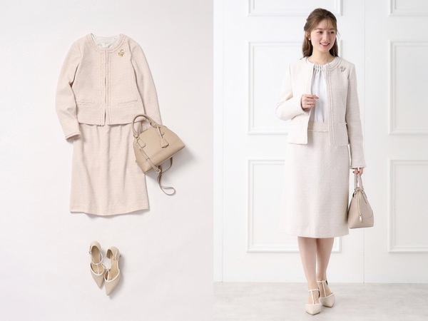 10月20日(金)よりオンラインストアにて先行予約を開始するアイテムは、繊細なフリンジ使いがポイントのノーカラージャケットや、セットアップで着用可能なAラインフレアスカートなど、大切なセレモニーシーンはもちろんのこと、普段のお仕事服としても使えるデザインの商品をラインナップいたします。また、ウォッシャブル機能付きで、デイリーユースに嬉しいイージーケアアイテムです。